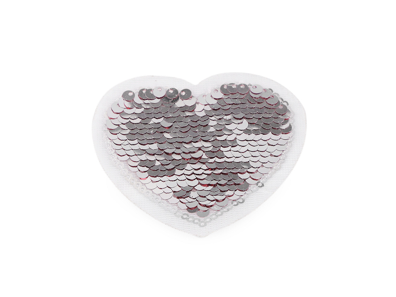 Nažehlovačka srdce, je po bocích zdobená stříbrnými flitry. Flitry uvnitř srdce jsou důmyslně našité, po jejich pohlazení proti směru se otočí a ukáží svou druhou, jinak barevnou stranu. Jsou oblíbené zejména u dětí a teenagerů, kteří si tak mění vzhled svého oblečení. Nažehlovačky mají kvalitní provedení, spodní stranu tvoří lepicí vrstva, která po nažehlení pevně drží na látce.