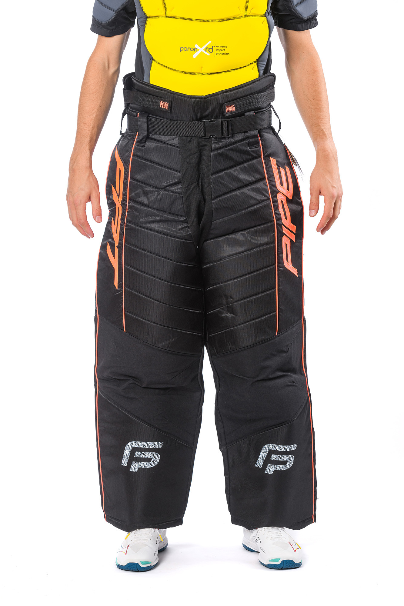 Vyztužené brankářské kalhoty vyrobené z nylonu a polyesteru. Lehké a vzdušné, speciální materiál na kolenou umožňuje brankářům hladký skluz na všech površích. Stažení v pase zajišťují kromě všité gumy a pásku i speciální popruhy na suchý zip, které jsou umístěné na bocích. Ke snadnému navlékání kalhot slouží i zipy na nohavicích.
