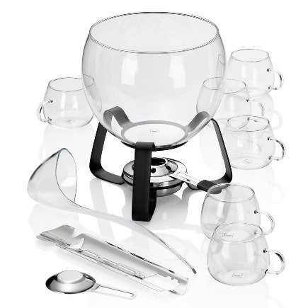 Pro stylové večery s přáteli.Sada obsahuje:- žaruvzdornou skleněnou punčovou mísu,- objem 3,5 l,- 6 sklenic, - akrylovou naběračku,- nerezové kleště na cukr,- kovový stojan průměr 13,5 cm,- bezpečnostní hořák na pastu z nerezové oceli.Upozornění: Nelijte rum přímo na hořící cukrovou homoli.