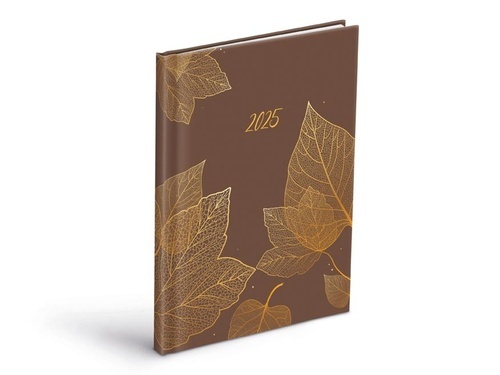 Týdenní diář pro rok 2025 ve formátu A5, v hnědé barvě, s motivem listů, který je výborným pomocníkem pro organizování Vašeho času. Diář má odtrhávatelný spodní rožek, který umožní rychlé nalistování aktuálního týdne. Povrch obálky je vyroben z lesklého lamina.