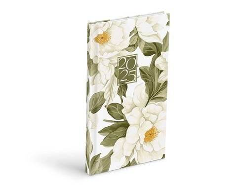 Týdenní diář pro rok 2025 s motivem bílých květů. Je výborným pomocníkem při organizování Vašeho času. Povrch obálky je vyroben z lesklého lamina. Diář má odtrhávatelný spodní rožek, který umožní rychlé nalistování aktuálního týdne.