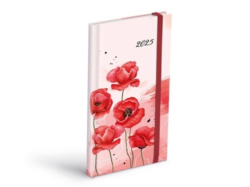 Týdenní diář pro rok 2025 s motivem květů vlčího máku, s uzavíráním na gumičku. Je výborným pomocníkem při organizování Vašeho času. Povrch obálky je vyroben z lesklého lamina. Diář má odtrhávatelný spodní rožek, který umožní rychlé nalistování aktuálního týdne.