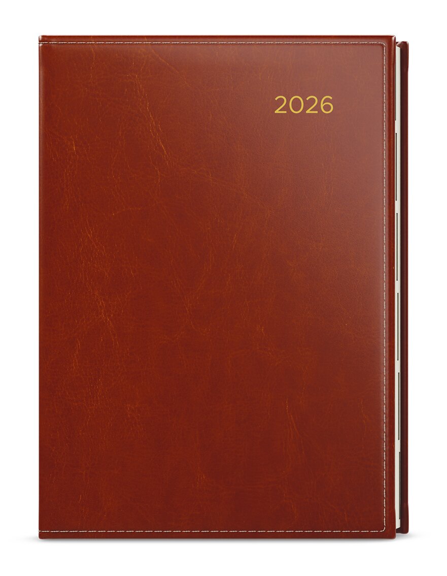 Denní diář A5 vyrobený z hnědé koženky s moderní zlatou ražbou roku. Diář, který povýší jakoukoli Vaši schůzku. Výjimečností tohoto diáře je, že soboty i neděle jsou na každé stránce zvlášť. jemný hladký materiál s lesklým povrchem, ražba roku, obšití v béžové barvě, jednostranná pěnová výplň desek, šitá vazba V8, kapitálky, stužka, perforované rožky, ofset, 70g/m2, krémový papír, indexové výseky