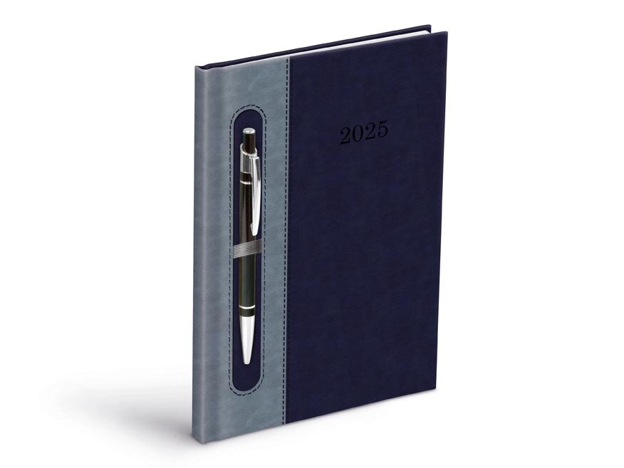 Týdenní diář pro rok 2025 ve formátu A5, v kombinaci tmavě modré a šedé barvy, s poutkem na propisku a uzavíráním na gumičku. Povrch obálky je vyroben z měkčeného materiálu příjemného na dotek. Je výborným pomocníkem pro organizování Vašeho času.
