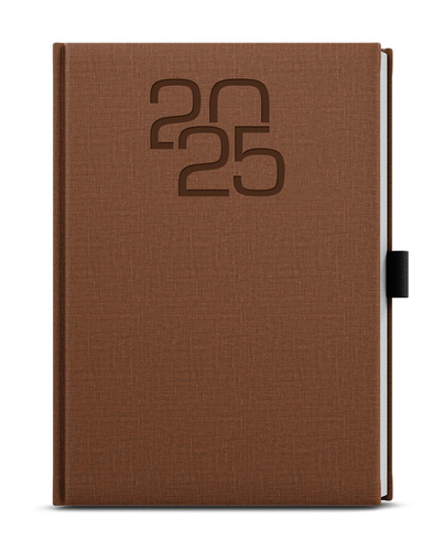 Týdenní diář hnědé barvy formátu A5 vyrobený ze zajímavého materiálu s moderní ražbou roku a poutkem na tužku. číst celé