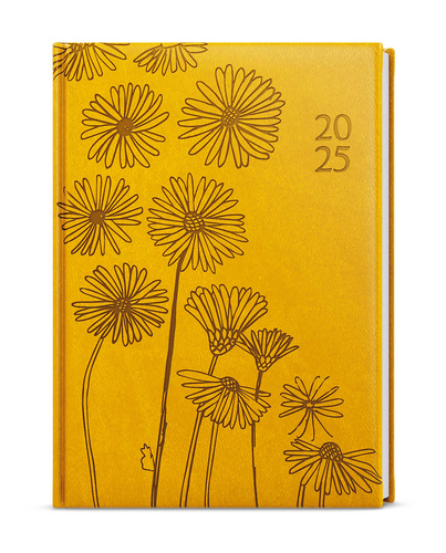 Týdenní diář okrové barvy vyráběný z jemné hladké vivelly s efektní ražbou motivu Slunce. Formát A5 je vhodný do tašky a má velký prostor pro poznámky a plánování.
