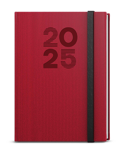 Týdenní diář formátu A5 vyrobený ze strukturovaného materiálu v červené barvě a s gumičkou. Oblíbená grafika vnitřního bloku Vám pomůže účelně plánovat Vaše dny.