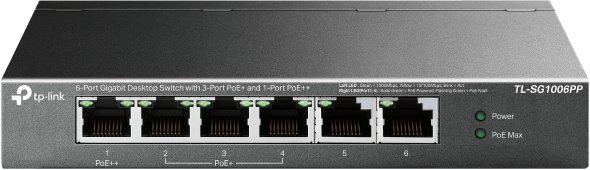 Switch TP-Link TL-SG1006PP je vybavený celkem šesti 10/100/1000Mbps RJ45 porty. Z toho má 1 PoE++ port a 3 PoE+ porty. Switch spolupracuje se standardem IEEE 802.3af/at/bt (kompatibilní s PD). Pomocí kabelu současně přenášíte data a napájíte zařízení. Port 1 (standard 802.3af/at/bt PoE++) poskytuje výkon až 60 W. Porty 2-4 (standard 802.3af/at PoE+) mají výkon až 30 W na každém PoE+ portu. Celkový výkon na napájení PoE dosahuje hodnoty 64 W. K přepínači připojíte IP kamery, přístupové body, IP telefony, počítače, tiskárny a další podobná kompatibilní zařízení.
