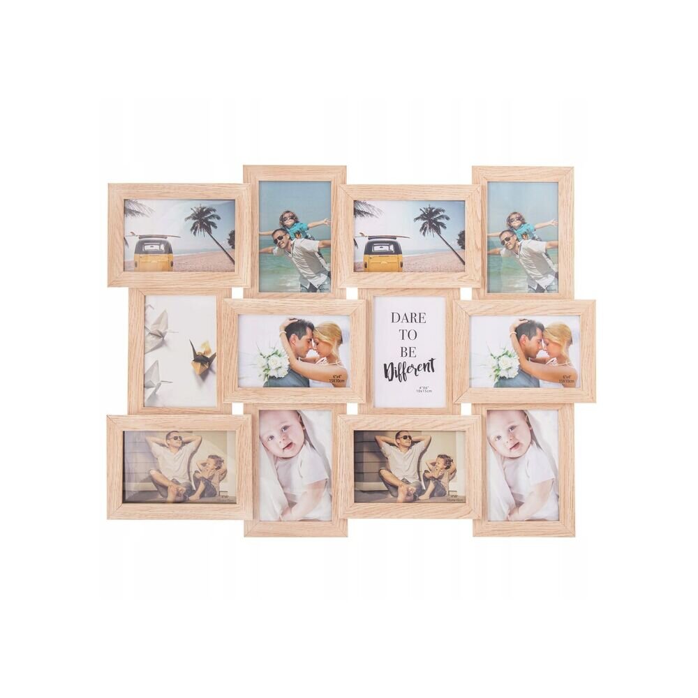 Nástěnný rámeček pro 12 fotografií ve formátu 10x15 cm. Imitace světlého dřeva. Vodorovné uchycení na zeď. Celkové rozměry 62x47 cm.