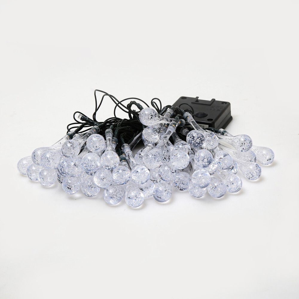 Řetěz je osazen elegantními LED světýlky ve tvaru kapek, které při rozsvícení vytvářejí měkké a teplé světlo. Kapky mají texturu jemně pomačkaného skla, což dodává celkovému dojmu luxusní nádech. Jakmile se setmí, světélka se automaticky rozsvítí díky zabudovanému senzoru.