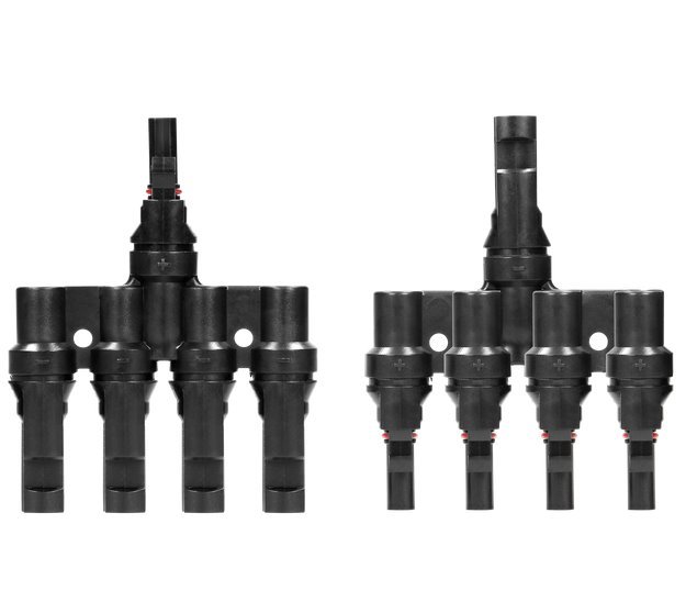 Rozbočovací konektor je vyroben z vysoce pevnostního plastu a je opatřen gumovými těsnícími vložkami. Používá se k paralelnímu propojení 4 solárních panelů.
