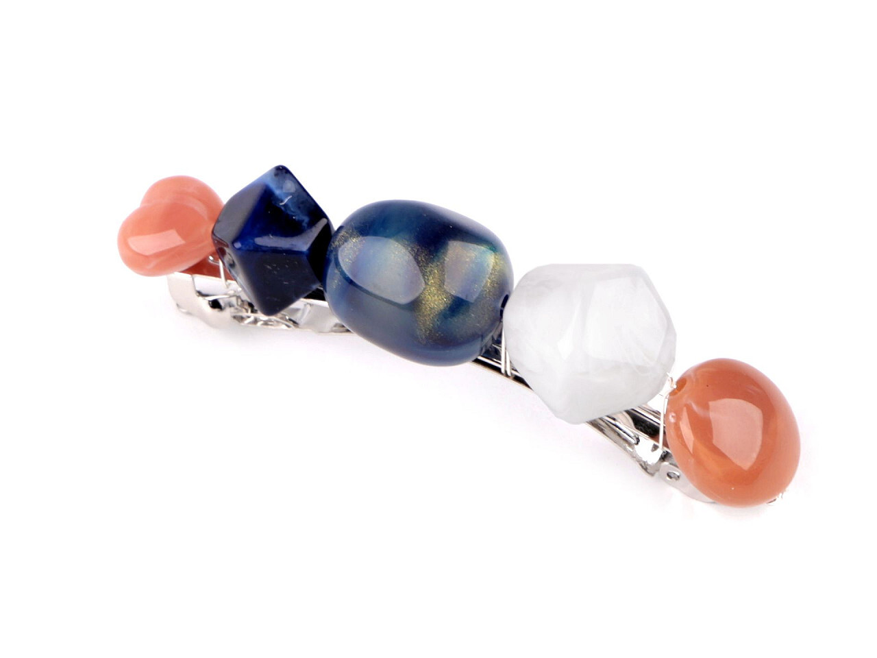 Francouzská spona zdobená akrylátovými kameny, které jsou inspirovány pravými minerály, poutavě ozdobí váš účes. Ať už máte jemné prameny nebo husté lokny, touto sponou snadno sepnete vlasy do copu nebo vytvoříte elegantní drdol, který bude vypadat, jako kdyby ho vytvořil profesionál. Spona má kvalitní celokovové provedení, zacvakávací mechanismus je pevný. Délka části pro vlasy je 5,5 cm.