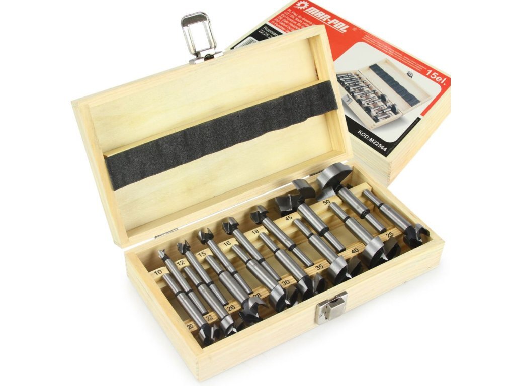 Sada 15 ks stopkových fréz - sukovníků do dřeva o rozměrech 15 - 50 mm v dřevěném pouzdře. Středový hrot zajišťuje přesné umístění vrtáku, hrany břitů zajišťují přesné vrtání otvorů bez vylamování. Určeno pro vrtání přesných otvorů bez trhání hran do měkkého dřeva, překližky. Sada je zabalena v dřevěné krabičce. Vrtáky jsou vyrobeny z vysoce kvalitní oceli. Tento vrták má válcovou stopku a je určen pro všechny typy vrtáků.