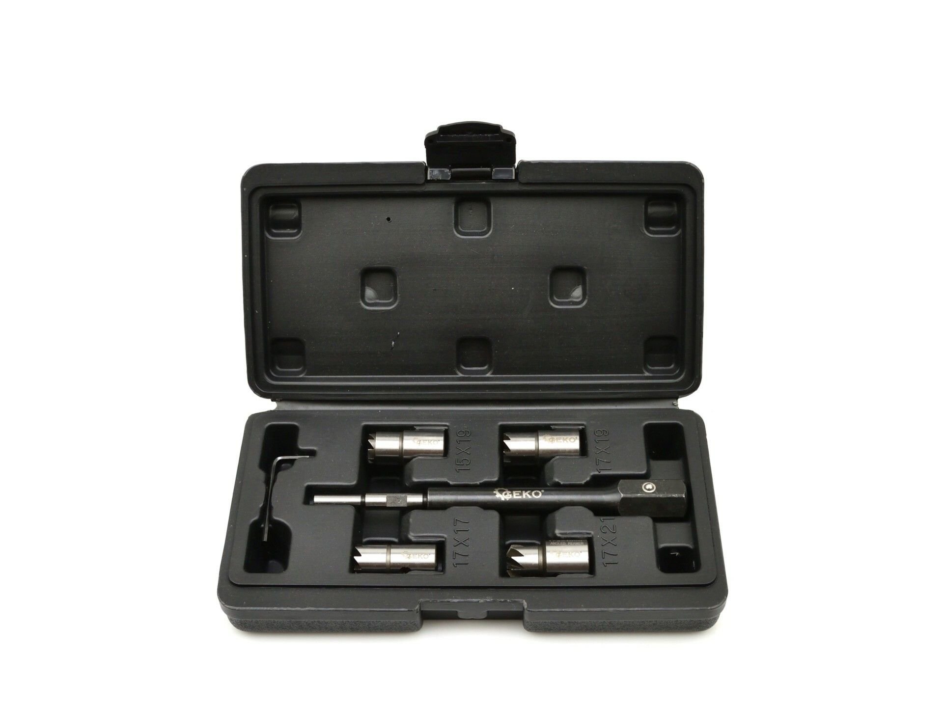 Sada fréz na opravu sedel vstřikovačů dieselových motorů. Zabroušení sedel při výměně nebo jen opětovné instalaci starých vstřikovačů zvyšuje těsnost spojení a tím i efektivitu spalování. Baleno v plastovém kufříku.
