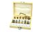 Sada 12 dřevoobráběcích fréz umožňuje přesné zpracování materiálu. HSS rychloupínací čepele umožňují použití nožů pro zpracování masivního dřeva, dřevotřískové desky, MDF a dalších materiálů na bázi dřeva. Použité ložiska snižují valivý odpor, což je důvod, proč se frézy jsou ideální pro tvarování kulatého materiálu. Celý je umístěn v praktickém dřevěném pouzdře, kde každý řezač má své vlastní podepsané místo.