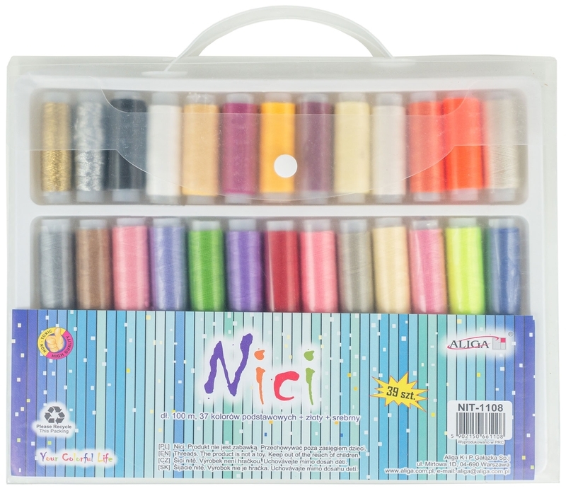 Zestaw nici w plastikowej, zamykanej walizce. Opakowanie zawiera 39szt. x długość 100m.:. 37 kolorów podstawowych i 2 kolory metalizowane - złoty i srebrny. Sposób pakowania: 1/72