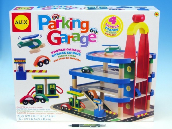 Garáž 4 patra dřevo 52,7x42,5x48cm + 4 auta + vrtulník v krabici