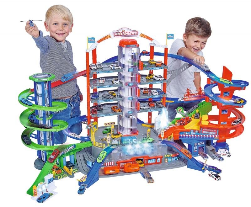 Velká herní garáž o šířce téměř 1,30 m je největší nový výrobek ve světě Majorette! Garáž se skládá ze sedmi herních ploch a má až 35 parkovacích a skladovacích prostor. Srdcem stanice je motorizovaný spirálový výtah, který současně nese až devět kovových autíček. Jakmile jsou nahoře, automatické přepínače rozdělují vozy do čtyř různých jízdních pruhů. Šest různých světelných a zvukových efektů, stejně jako nespočet herních stanic, jako je vlaková stanice, čerpací stanice s benzínovým čerpadlem, autoservisem a myčkou aut, požární stanice, policejní stanice s tajným úkrytem nebo heliport, nabízí neomezenou zábavu. Součástí je 6 kovových autíček, vlak poháněný na baterie, automatické výhybky, tunel s funkcí havárie a 2 motorizované výtahy. Vrtulník není součástí. Rozměry po sestavení: 128 x 78 x 73 cm.