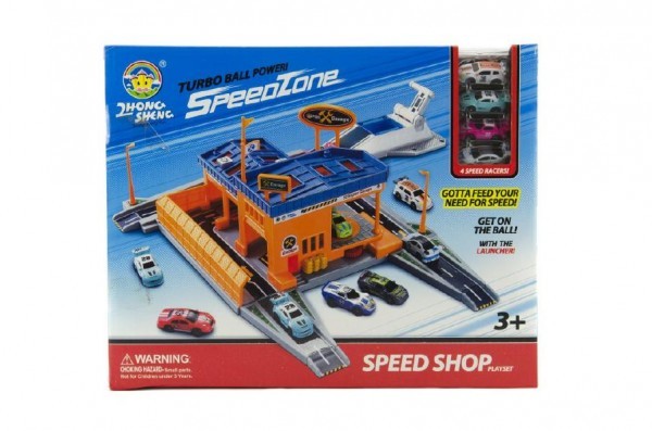 Garáž s autíčky 4ks + doplňky plast v krabici 32,5x26x9cm