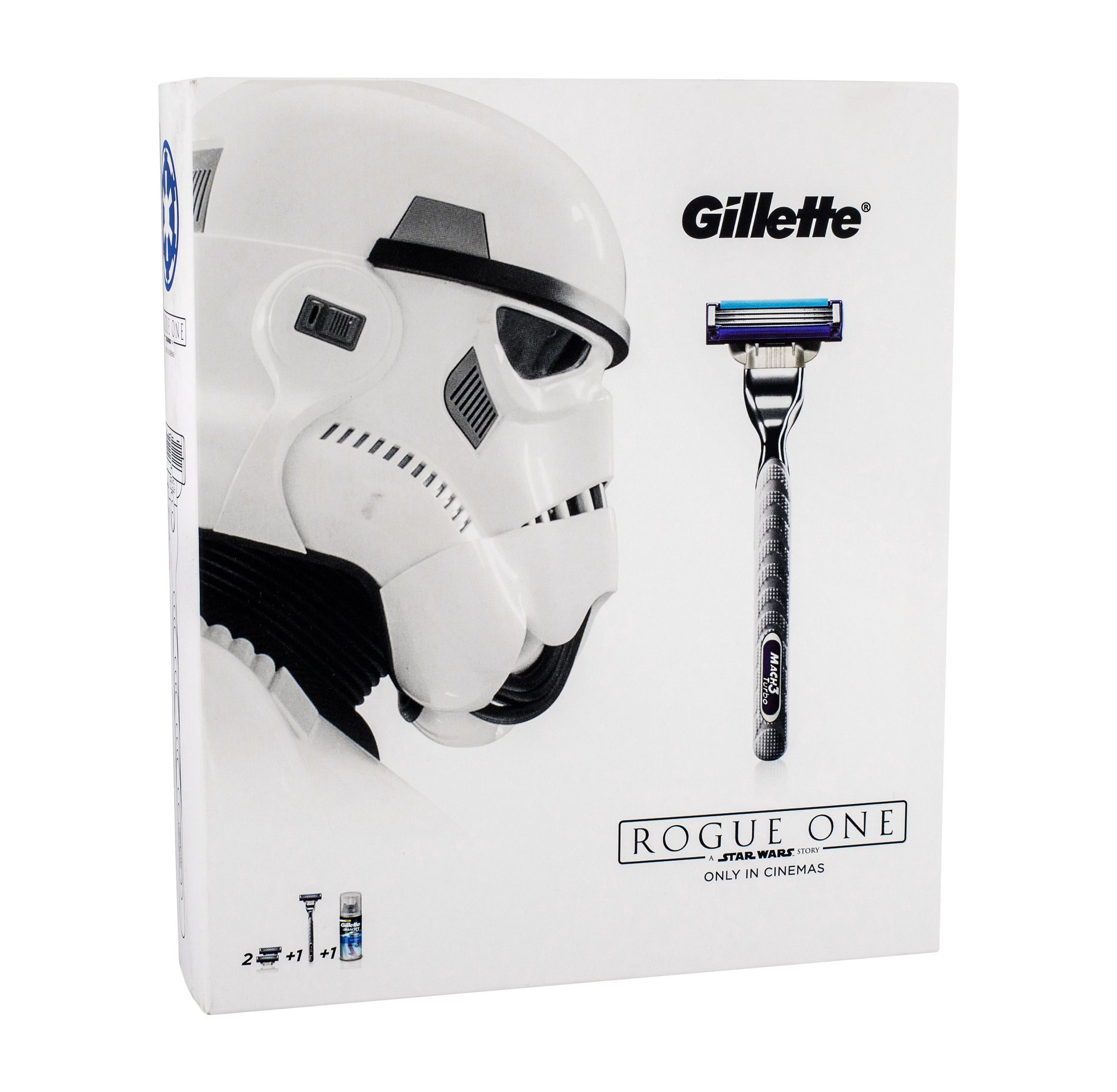 Dárková sada **Gillette Mach3 Turbo Star Wars**. Gillette Mach3 Turbo je určen pro dokonalejší oholení s minimálním podrážděním pokožky, i přesto, když se holí proti směru růstu vousů. Tři Anti-Friction břity (snižují tahání vousů) Mach 3 Turbo oholí každý vous ještě důkladněji s menším podráždením. Měkké, ochranné mikrolamely opatrně napínají pokožku, a proto holení je rovnoměrně a bez nadměrného tlaku na pokožku. Vylepšený indikační zvlhčující pásek pomáhá strojku Mach 3 Turbo hladce se klouzat po pokožce i při velmi častém holení. **Složení kazety**: Holicí strojek s jednou hlavicí 1 ks Náhradní hlavice 2 ks Gel na holení Extra Comfort 75 ml