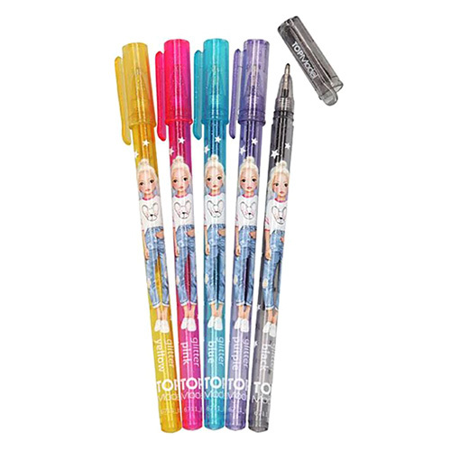 Balení v plastovém pouzdře obsahuje 5 ks atraktivních gelových kuličkových per s klipem a silnějším hrotem. Pera ve vytříbeném designu jedinečné značky Top Model jsou nejen praktickou psací potřebou, ale rovněž exkluzivní stylový doplněk. Super měkké a kvalitní gelové inkoustové náplně s glitry v černé, fialové, modré, žluté a růžové barvě zajistí bezproblémové psaní či vybarvování. Výjimečná kuličková pera, která nemůžou chybět v žádném dívčím penále či kabelce!