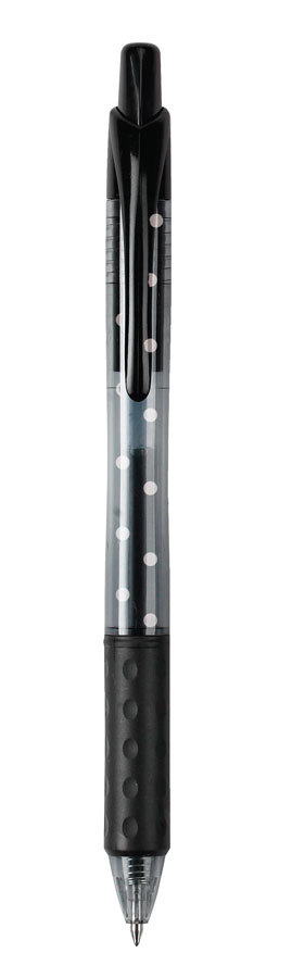 Gelové pero s gumovým úchopem, černá barva těla odpovídá barvě náplně. Nápaditý tečkovaný potisk. Šíře hrotu 0,5mm. číst celé
