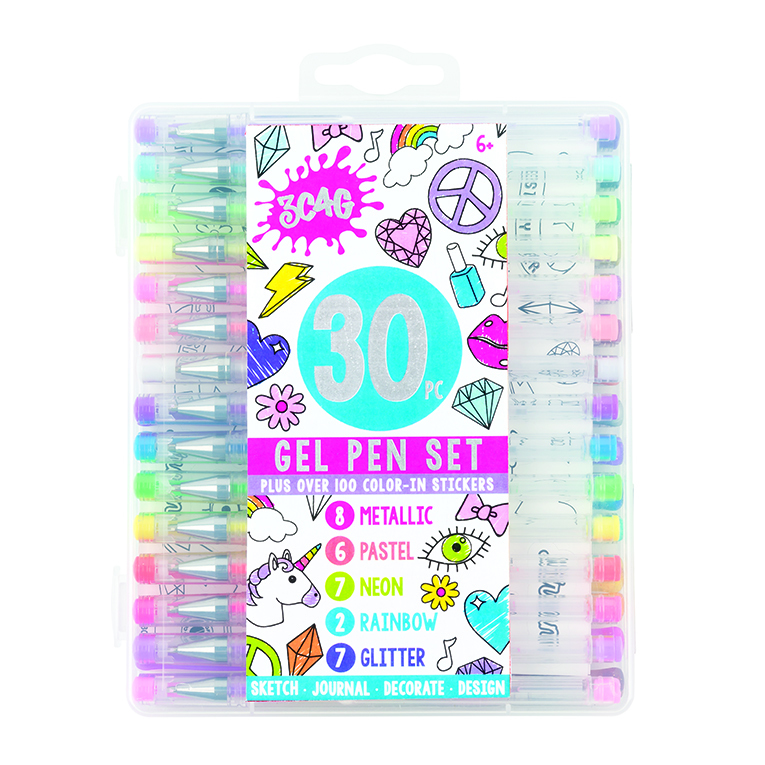 - 30 gelových per s různými efekty: metalické, pastelové, neonové, duhové a třpytivé