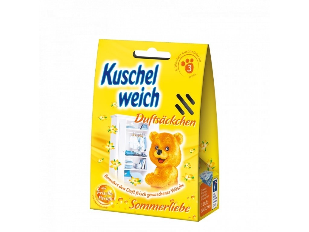 Kuschelweich vonné sáčky do šatníku - vůně Sommerliebe - letní láska. Tři měkké polštářky s vonnými svěžími perlami přinášejí do Vašeho šatníku letní vůni na dlouhých šest týdnů.