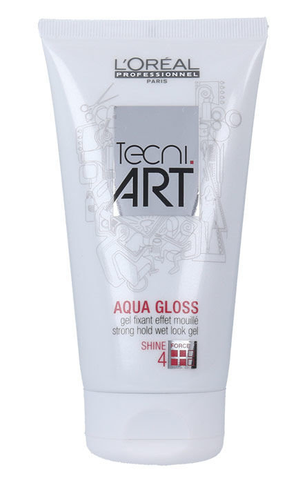 Gel na vlasy **L´Oréal Paris Tecni Art Aqua Gloss**. Gel L´Oréal Paris Tecni Art Aqua Gloss dodá vlasům silnou fixaci a jemný lesk. Nemastný gel nezatěžuje vlasy, snadno se nanáší a vlasům dodá mokrý vzhled. Vhodné pro všechny typy vlasů.
