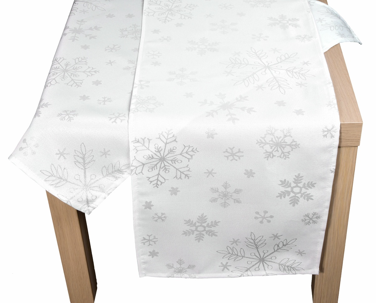 Elegantní vánoční oboustranný žakárový ubrus s luxusním vzorem vloček vytvoří náherně prostřený stůl.