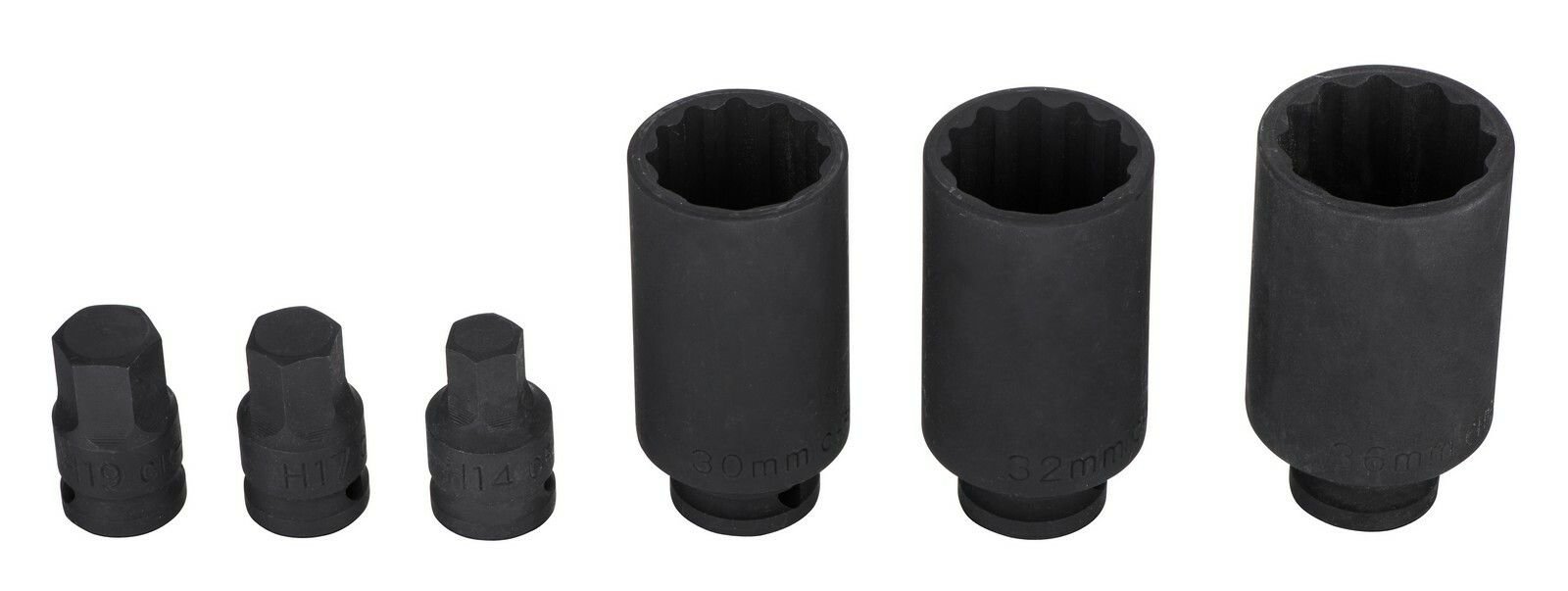 3x nástrčná úderová hlavice, 12hranná, velikosti: 30, 32, 36 mm3x zástrčná úderová hlavice Imbus, velikosti: H14, H17, H19 Baleno v plastové kazetě.