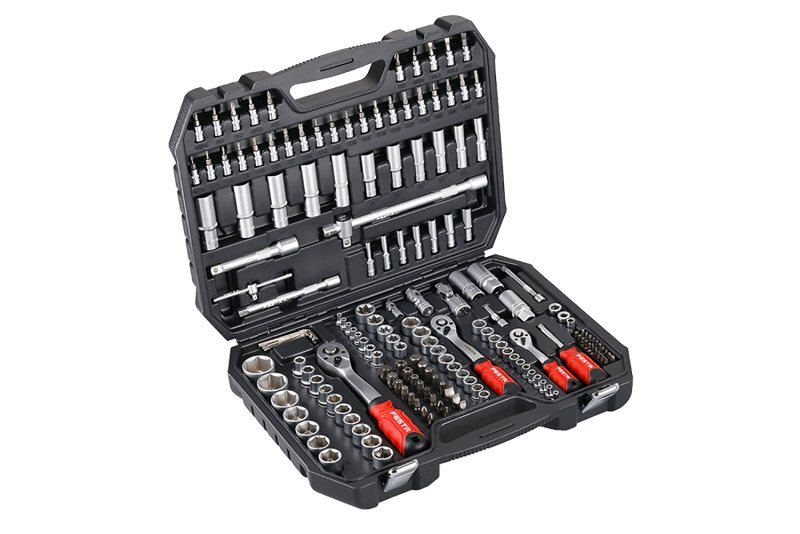 Sada hlavic a nástavců 1/4,3/8,1/2. Všechny části jsou vyrobeny z chrom-vanadiové oceli kováním, dobře kombinovaná sada v přehledném plastovém kufru, ráčny s přepínací páčkou a uvolňovacím tlačítkem, ergonomicky tvarovaná rukojeť.
