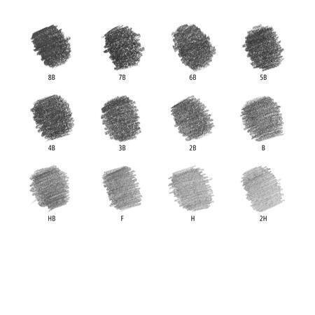 Vysoce kvalitní tužky Tvrdost: 8B, 7B, 6B, 5B, 4B, 3B, 2B, B, HB, F, H, 2H Speciální složení tuhy obsahující vysoký podíl uhlíku pro matné barvy Průměr tuhy: 7B-6B: přibl. 3,6 mm, 5B-3B: přibl. 2,5 mm, 2B-2H: přibl. 2,0 mm Tužky pro psaní, kreslení, matný kreslící film Tuha odolná proti polámání S certifikátem PEFC Kovová krabička