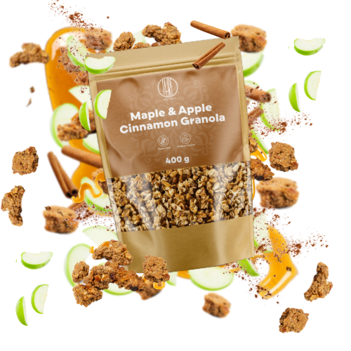 Představte si do křupava opečené velké kousky granoly z prvotřídních surovin. Lahodnou směs s perfektní křupavou texturou, neodolatelnou chutí jablek, javorového sirupu a příjemnou vůní skořice, připomínající čerstvě upečený koláč.
