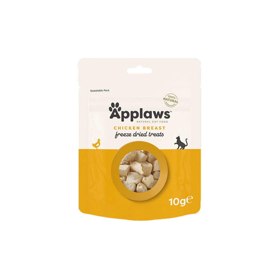 Křehké, chutné, čerstvé! Mrazem sušené pamlsky Applaws jsou ze 100% čistého masa, nic navíc!100% přírodní pamlsek / doplňkové krmivo pro dospělé kočky a psy. Kuřecí maso je lehce stravitelné a pro kočky velmi chutné, přirozeně bohaté na Taurin a Omega-6 mastné kyseliny. Tento pamlsek je vhodný také pro pejsky.Mrazem sušené pamlsky jsou nejzdravější a nejchutnější pamlsky, které můžete svým mazlíčkům nabídnout, jsou vyrobeny ze syrového masa sušením mrazem (lyofilizací). Tato metoda zpracování zachovává kvalitu masa v raw stavu (odpovídající syrové stravě), vysoký obsah bílkovin, chuť i aroma a nutriční hodnoty. Pamlsky jsou zcela bez glycerinu, konzervantů, barviv, ochucovadel a jakýchkoliv plnidel či náhražek. Prostě jen čisté maso!Lyofilizace je nejčistší technologie zpracování a nejefektivnější způsob uchování kvality syrového masa. Zároveň nabízí maximální komfort pro používání. I když mají pamlsky kvalitu syrového masa, můžete je vzít kamkoliv a kdykoliv, na rozdíl od syrového masa se vám od nich nic neumaže, nekazí se po otevření ani v horku, nepotřebují uchování v lednici a velmi dobře se podávají, protože jsou křehké.Appaws mrazem sušené pamlsky:- lyofilizováno pro uchování chuti a čerstvosti- 100% čisté a přírodní- vysoká nutriční hodnota- lyofilizované maso je přirozeně bohaté na Taurin a Omega-6- vynikající chuť masa téměř identická s čerstvým- zcela bez glycerinu a jiných konzervantů- zcela bez obilovin a lepku- vhodné pro monoprotein výživu a alergiky- použité suroviny překračují nejvyšší světové standardy pro výrobu a udržitelnostMaso v kuřecích pamlscích pochází z chovů, v nichž jsou kuřata chována ve volných výbězích, krmena přirozeně bez použití hormonů a antibiotik, jsou zdravá a v potravinářské kvalitě, nikoliv z nuceného výseku. Pro výrobu rybích pamlsků jsou používány ryby pocházející z oceánů a jsou loveny způsobem, který neohrožuje delfíny - Dolphin Friendly Product! Složení: 100% kuřecí prsa.Analytické složky: Hrubý protein 85%, hrubé popeloviny 4%, hrubé oleje a tuky 7%, hrubá vláknina 0,1%, vlhkost 5%. Energie: 4178 kcal/kgPoužití: Doplňkové krmivo / pamlsek pro dospělé kočky. Podávejte samostatně jako uspokojivou svačinu nebo rozdrťte na suché krmivo Applaws pro chutné a vyvážené jídlo.Balení: 10gUpozornění: Zvíře by mělo mít stálý přístup k čerstvé vodě. Uchovávejte na suchém místě, po otevření sáček dobře uzavřete zipovým zavíráním.Značka Applaws vyrábí 100% přírodní krmiva, která obsahují pouze kvalitní maso, zeleninu a bylinky. Celý sortiment krmiv je založen na kvalitě použitých surovin. Krmiva neobsahují obiloviny, vedlejší živočišné produkty, sójovou bílkovinu, barviva ani konzervanty. Jsou přirozeně bezlepková a hypoalergenní. Výrobce Applaws má od roku 2021 certifikát B Corporation („B Corp“), což znamená, že transparentně dodržuje nevyšší standardy udržitelnosti, environmentální výkonnosti a odpovědnosti ve vztahu k životnímu prostředí, zaměstnancům, zákazníkům, dodavatelům nebo komunitám.Kvalitu poznáte na první pohled skrz průhledný talířek na kapsičce. S Applaws víte, čím krmíte!Výrobce/značka: ApplawsOficiální dovozce a distributor pro ČR: Rebel Dog s.r.o.Poslední aktualizace: 2025/06