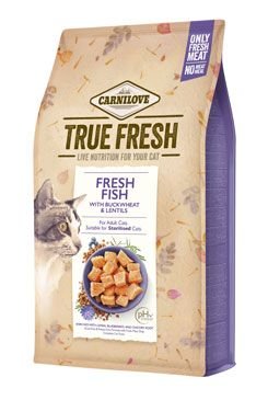 CARNILOVE TRUE FRESH FISH. Receptura bez obilovin a brambor pouze s čerstvým masem pro dospělé kočky. Vhodné pro kastrované kočky. Kompletní krmivo pro kočky.