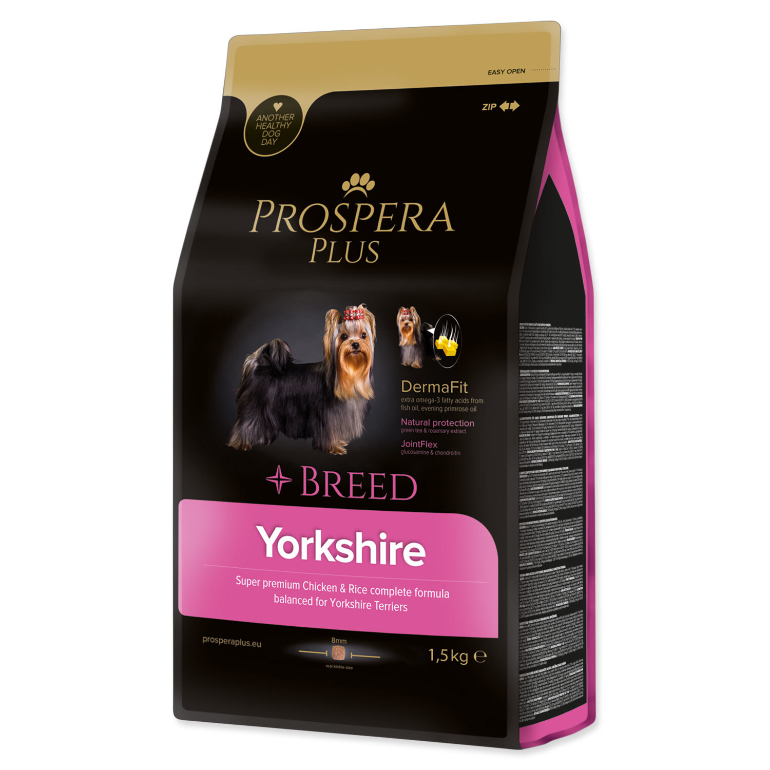 PROSPERA PLUS Yorkshire je superpremiové krmivo, navržené s ohledem na unikátní výživové potřeby plemene Yorkshirský teriér. Základem receptury je kvalitní lehce stravitelné kuřecí maso doplněné o rybí tuk (omega 3 mastné kyseliny) a pupalkový olej, které podporují zdravou srst tohoto plemene. Funkční přísady extrakt ze zeleného čaje a rozmarýnu posilují imunitu pejsků. Chondroprotektiva glukosamin a chondroitin pomáhají posilovat a stabilizovat kosti a klouby.Speciální tvar granulí pomáhá k prevenci před zubním kamenem a plakem.