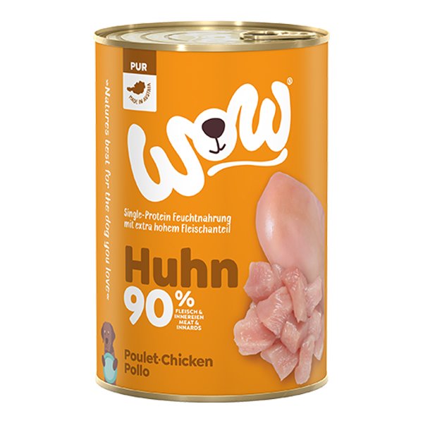 WOW Pure Kuřecí monoprotein s 90% obsahem pouze kuřecího masa a vnitřností vysoké kvality je kompletní krmivo pro dospělé psy všech plemen.