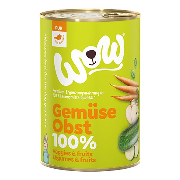 WOW Pure Zelenina a ovoce je přílohová směs zeleniny a ovoce s minerály určená jako doplňkové Vegan krmivo (doplněk stravy) pro všechny WOW konzervy, zejména k řadě WOW Pure z čistého masa, jako doplněk k čerstvému masu pro psy krmené barfem či k vařené stravě. Vhodné pro psy všech velikostí a plemen.