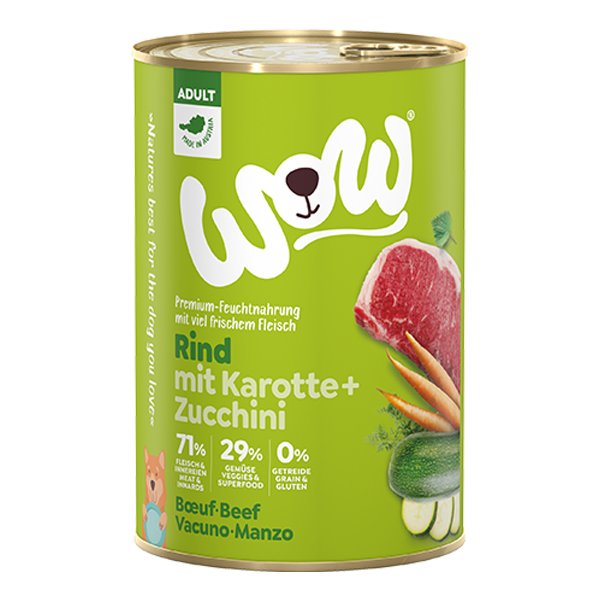 WOW Hovězí s karotkou je kompletní mokré krmivo pro dospělé psy všech plemen se 71% obsahem masa a vnitřností od předního rakouského výrobce. Maso je doplněno zeleninou, bylinkami z Alp a vysoce kvalitním lněným olejem. Konzervy jsou ručně plněné v rodinné rakouské firmě z místních, většinou alpských, surovin ze zdravé přírody.