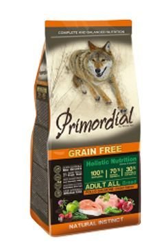 Primordial Kuře a Losos je kompletní bezobilné vysoce stravitelné krmivo bohaté na proteiny vysoké biologické hodnoty a obsahuje vhodnou kompozici aminokyselin. Kuřecí maso, striktně z volného výběhu, poskytuje snadno stravitelné bílkoviny a atraktivní chuť, kterou psi milují. Losos, jako všechny ryby, je bohatým zdrojem omega 3 mastných kyselin, které vykonávají důležitou kosmetickou funkci pro kůži a srst a jsou velmi prospěšné pro kardiovaskulární systém (srdce a cévy). Dále je bohatý na minerální soli a jeho bílkoviny jsou snadno stravitelné. Ovoce a zelenina bohaté na vitaminy, minerály a fytonutrienty, trávicí vlastnosti jablka, antioxidační funkce granátového jablka a šípku a podpora jater ze strany ostropestřce dodávají tomuto krmivu dokonalou rovnováhu chuti a živin. Jedná se o skutečně holistický produkt, který aktivně přispívá k celkovému zdraví psa.