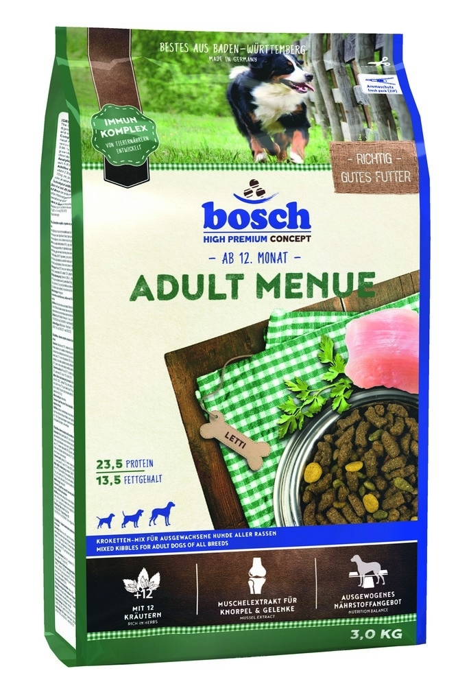 Vysoce hodnotné, kompletní krmivo pro dospělé psy s běžnou aktivitou. ADULT MENUE je vyváženou směsí jednotlivých masových a zeleninových kroket, s menším podílem upravených obilných vloček, která bude Vašemu psu zcela jistě chutnat. Prvotřídní použité komponenty jsou velmi pečlivě vybrané, zvláště šetrně vyvážené a obohacené kvalitní bylinnou směsí.