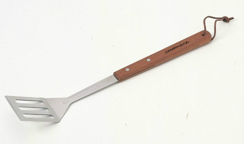 Nerezová obracečka s prodlouženou dřevěnou rukojetí.