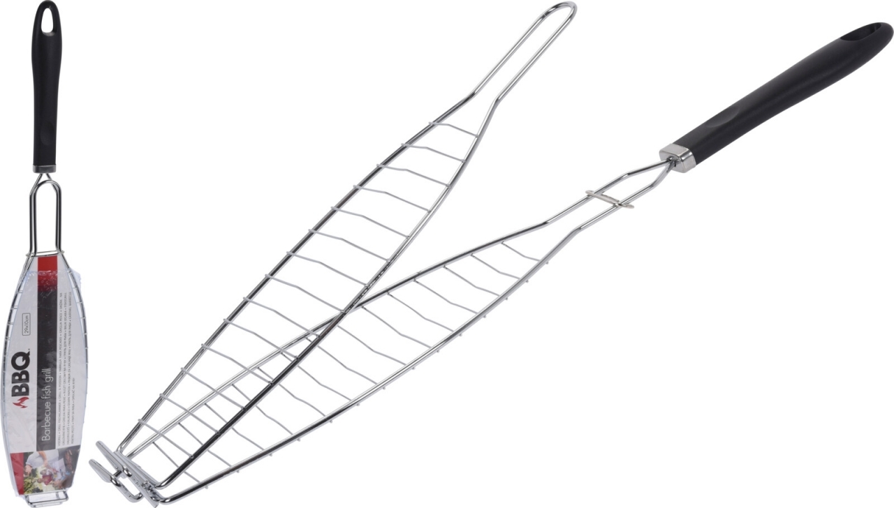 Pochromovaný grilovací rošt na ryby s černou plastovou rukojetí.