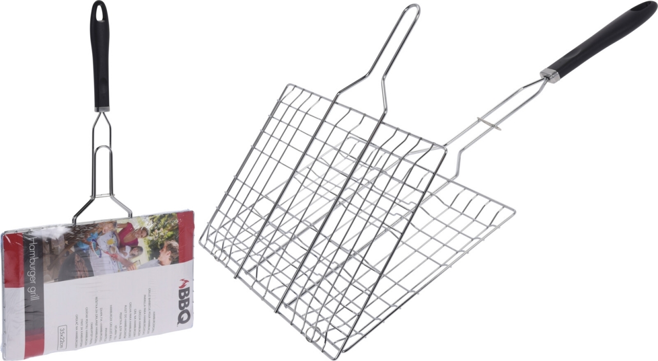 Grilovací rošt na hamburgery. Pochromovaný s plastovou rukojetí.