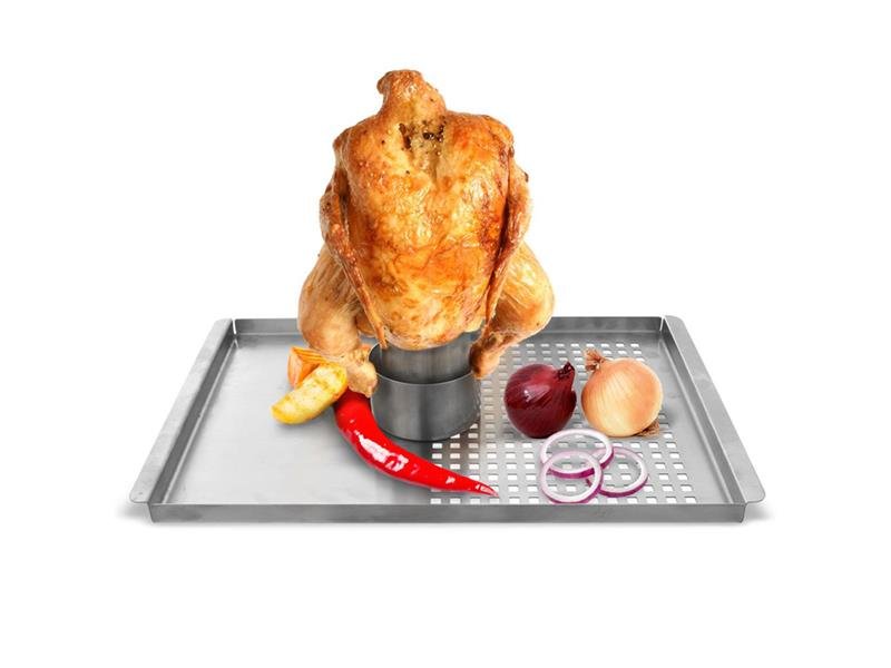 Plech grilovací se stojanem skvěle využijete k přípravě grilovaného kuřete, zeleniny, brambor a dalších pochutin na grilu nebo v troubě. Dovnitř stojanu dáte marinádu nebo koření a víno, kuře na stojan napíchnete, kolem položíte zeleninu, brambory, houby a plech umístíte na gril nebo do trouby, můžete použít i na přímý plamen. Pohodlně můžete obsah během přípravy otáčet nebo odstavit, pokud by se vám pokrm připravoval příliš rychle a později dát zpět na žár grilu nebo do trouby. Plech je z části opatřen otvory, přes které proniká žár. Díky dvěma úchytům se snadno přenáší - nutnost použití kuchyňských chňapek.