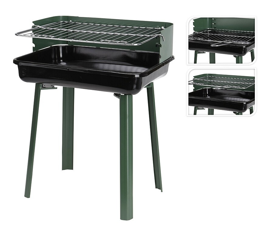 BBQ, SIZE 360X310X450MM, WINDSHIELD H80X0,7MM, POWDER COATED STEEL, COOKING GRID 330X265XDIA2XDIA3XDIA4MM CHROMED STEEL, FIRE BOWL 350X280X0,7MM ENAMELLED STEEL IN COLOR BLACK, COOKING HEIGHT 380X405X430MM, WEIGHT 1800 GRAM, CLICK IN SYSTEM, NO SCREWS, GS-TUV. GREEN COLOUR (PANTONE 5615) WITH BLACK TRAY, EACH IN COLOUR BOX. BBQ LINE ARTWORK, 6PCS IN MASTERCARTON , GS-TUV/ 365X90X290MM, Colour Box: , 360X310X450MM / CFT 2,46,(6.174/40ft HQ)