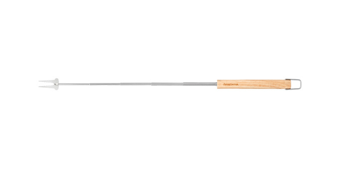 Vysunovací vidlička dlouhá 75 cm vynikající pro pohodlné a bezpečné opékání špekáčků, klobás apod. Složená měří jen 22 cm, hroty jsou zasunuty do rukojeti, vidlička je dokonale skladná. Vyrobeno z prvotřídní nerezavějící oceli, rukojeť z odolného dřeva gumovníku brazilského, s očkem pro...