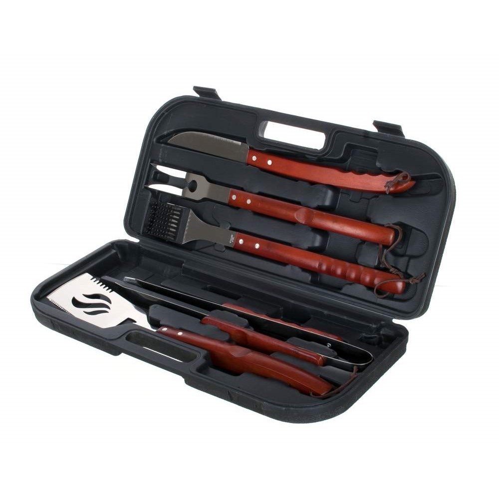 Nerezová sada s dřevěnou rukojetí v plastovém kufříku obsahuje: čístící drátěný kartáč 48 cm, grilovací zubaté kleště 45 cm, obracečka 48 cm, porcovací nůž s čepelí o délce 45 cm, vidlička se 2 hroty 46 cm.