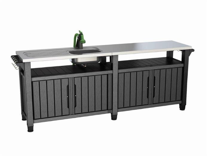 Rádi si v létě posedíte s rodinou a s přáteli venku na zahradě? Holdujete grilovaným pokrmům? Grilovací stolek Keter Unity Chef nabízí úžasnou kapacitu 415 litrů pro uložení kuchařského náčiní. Nerezová pracovní deska, integrovaný dřez, praktická rukojeť s háčky na pověšení utěrek, nastavitelné nohy stolku, otvírák na láhve a extra velká užitná police na skleničky a talíře dohromady vytvářejí dokonalý kuchyňský ostrůvek pro venkovní vaření, grilování, přípravu a servírování pokrmů a nápojů i pro mytí a utírání nádobí. Tento multifunkční grilovací stůl si prostě zamilujete!